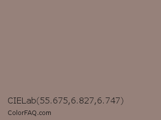 CIELab 55.675,6.827,6.747 Color is a normal color and the nearest color is Cinereous #98817b. Hex code #96817a and RGB value is rgb(150,129,122). In RGB color space, this color is composed of 59% red, 51% green, 48% blue, In CMYK color space, this color is composed of 0% cyan, 14% magenta, 19% yellow , 41% black , In HSL color space, this color has a hue angle of 15° , 12% saturation and 53% lightness.