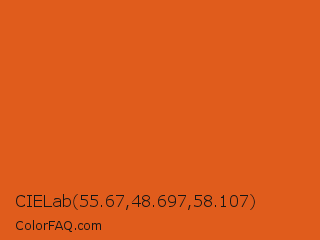 CIELab 55.67,48.697,58.107 Color is a normal orange color and the nearest color is Flame #e25822. Hex code #e05c1c and RGB value is rgb(224,92,28). In RGB color space, this color is composed of 88% red, 36% green, 11% blue, In CMYK color space, this color is composed of 0% cyan, 59% magenta, 88% yellow , 12% black , In HSL color space, this color has a hue angle of 20° , 78% saturation and 49% lightness.