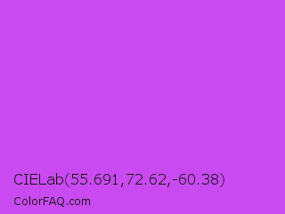CIELab 55.691,72.62,-60.38 Color is a light purple color and the nearest color is Medium Orchid #ba55d3. Hex code #c94af0 and RGB value is rgb(201,74,240). In RGB color space, this color is composed of 79% red, 29% green, 94% blue, In CMYK color space, this color is composed of 16% cyan, 69% magenta, 0% yellow , 6% black , In HSL color space, this color has a hue angle of 286° , 85% saturation and 62% lightness.