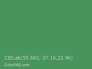 CIELab 55.692,-37.16,22.96 Color is a normal green color and the nearest color is Fruit Salad #4f9d5d. Hex code #47955c and RGB value is rgb(71,149,92). In RGB color space, this color is composed of 28% red, 58% green, 36% blue, In CMYK color space, this color is composed of 52% cyan, 0% magenta, 38% yellow , 42% black , In HSL color space, this color has a hue angle of 136° , 35% saturation and 43% lightness.