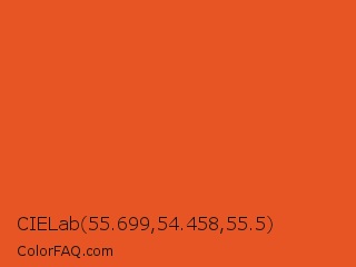 CIELab 55.699,54.458,55.5 Color is a normal color and the nearest color is Flame #e25822. Hex code #e75524 and RGB value is rgb(231,85,36). In RGB color space, this color is composed of 91% red, 33% green, 14% blue, In CMYK color space, this color is composed of 0% cyan, 63% magenta, 84% yellow , 9% black , In HSL color space, this color has a hue angle of 15° , 80% saturation and 52% lightness.