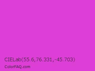CIELab 55.6,76.331,-45.703 Color is a normal magenta color and the nearest color is Steel Pink #cc33cc. Hex code #dc3ed6 and RGB value is rgb(220,62,214). In RGB color space, this color is composed of 86% red, 24% green, 84% blue, In CMYK color space, this color is composed of 0% cyan, 72% magenta, 3% yellow , 14% black , In HSL color space, this color has a hue angle of 302° , 69% saturation and 55% lightness.