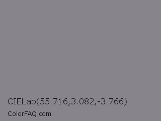 CIELab 55.716,3.082,-3.766 Color is a normal violet color and the nearest color is Monsoon #8a8389. Hex code #88848c and RGB value is rgb(136,132,140). In RGB color space, this color is composed of 53% red, 52% green, 55% blue, In CMYK color space, this color is composed of 3% cyan, 6% magenta, 0% yellow , 45% black , In HSL color space, this color has a hue angle of 270° , 3% saturation and 53% lightness.