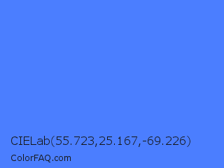 CIELab 55.723,25.167,-69.226 Color is a light blue color and the nearest color is Blueberry #4f86f7. Hex code #4b7eff and RGB value is rgb(75,126,255). In RGB color space, this color is composed of 29% red, 49% green, 100% blue, In CMYK color space, this color is composed of 71% cyan, 51% magenta, 0% yellow , 0% black , In HSL color space, this color has a hue angle of 223° , 100% saturation and 65% lightness.
