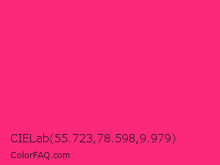 CIELab 55.723,78.598,9.979 Color is a normal rose color and the nearest color is Cerise Pink #ec3b83. Hex code #fc2978 and RGB value is rgb(252,41,120). In RGB color space, this color is composed of 99% red, 16% green, 47% blue, In CMYK color space, this color is composed of 0% cyan, 84% magenta, 52% yellow , 1% black , In HSL color space, this color has a hue angle of 338° , 97% saturation and 57% lightness.