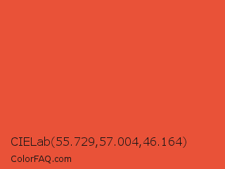 CIELab 55.729,57.004,46.164 Color is a normal red color and the nearest color is Carmine Pink #eb4c42. Hex code #e95238 and RGB value is rgb(233,82,56). In RGB color space, this color is composed of 91% red, 32% green, 22% blue, In CMYK color space, this color is composed of 0% cyan, 65% magenta, 76% yellow , 9% black , In HSL color space, this color has a hue angle of 9° , 80% saturation and 57% lightness.