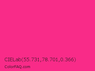 CIELab 55.731,78.701,0.366 Color is a normal rose color and the nearest color is Wild Strawberry Crayola #ff3399. Hex code #f92b88 and RGB value is rgb(249,43,136). In RGB color space, this color is composed of 98% red, 17% green, 53% blue, In CMYK color space, this color is composed of 0% cyan, 83% magenta, 45% yellow , 2% black , In HSL color space, this color has a hue angle of 333° , 94% saturation and 57% lightness.