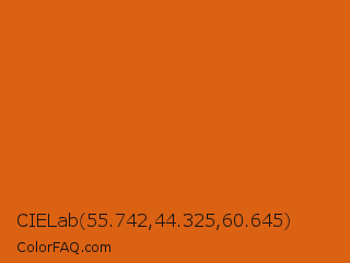 CIELab 55.742,44.325,60.645 Color is a normal orange color and the nearest color is Bamboo #da6304. Hex code #db6113 and RGB value is rgb(219,97,19). In RGB color space, this color is composed of 86% red, 38% green, 7% blue, In CMYK color space, this color is composed of 0% cyan, 56% magenta, 91% yellow , 14% black , In HSL color space, this color has a hue angle of 23° , 84% saturation and 47% lightness.