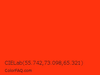 CIELab 55.742,73.098,65.321 Color is a normal red color and the nearest color is Red RYB #fe2712. Hex code #ff330d and RGB value is rgb(255,51,13). In RGB color space, this color is composed of 100% red, 20% green, 5% blue, In CMYK color space, this color is composed of 0% cyan, 80% magenta, 95% yellow , 0% black , In HSL color space, this color has a hue angle of 9° , 100% saturation and 53% lightness.