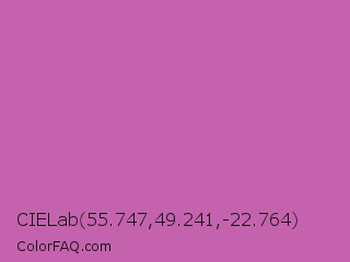 CIELab 55.747,49.241,-22.764 Color is a normal magenta color and the nearest color is Super Pink #cf6ba9. Hex code #c562ae and RGB value is rgb(197,98,174). In RGB color space, this color is composed of 77% red, 38% green, 68% blue, In CMYK color space, this color is composed of 0% cyan, 50% magenta, 12% yellow , 23% black , In HSL color space, this color has a hue angle of 314° , 46% saturation and 58% lightness.