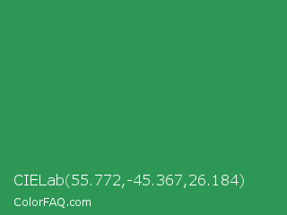 CIELab 55.772,-45.367,26.184 Color is a normal green color and the nearest color is Sea Green #2e8b57. Hex code #2d9856 and RGB value is rgb(45,152,86). In RGB color space, this color is composed of 18% red, 60% green, 34% blue, In CMYK color space, this color is composed of 70% cyan, 0% magenta, 43% yellow , 40% black , In HSL color space, this color has a hue angle of 143° , 54% saturation and 39% lightness.