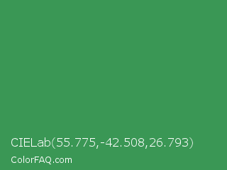 CIELab 55.775,-42.508,26.793 Color is a normal green color and the nearest color is Sea Green #2e8b57. Hex code #3a9755 and RGB value is rgb(58,151,85). In RGB color space, this color is composed of 23% red, 59% green, 33% blue, In CMYK color space, this color is composed of 62% cyan, 0% magenta, 44% yellow , 41% black , In HSL color space, this color has a hue angle of 137° , 44% saturation and 41% lightness.
