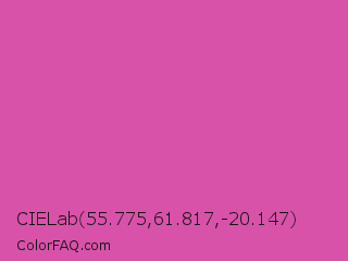 CIELab 55.775,61.817,-20.147 Color is a normal magenta color and the nearest color is Raspberry Pink #e25098. Hex code #d952aa and RGB value is rgb(217,82,170). In RGB color space, this color is composed of 85% red, 32% green, 67% blue, In CMYK color space, this color is composed of 0% cyan, 62% magenta, 22% yellow , 15% black , In HSL color space, this color has a hue angle of 321° , 64% saturation and 59% lightness.