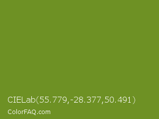 CIELab 55.779,-28.377,50.491 Color is a normal lime color and the nearest color is Olive Drab #6b8e23. Hex code #6e9124 and RGB value is rgb(110,145,36). In RGB color space, this color is composed of 43% red, 57% green, 14% blue, In CMYK color space, this color is composed of 24% cyan, 0% magenta, 75% yellow , 43% black , In HSL color space, this color has a hue angle of 79° , 60% saturation and 35% lightness.