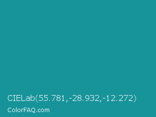 CIELab 55.781,-28.932,-12.272 Color is a normal cyan color and the nearest color is Blue Chill #0c8990. Hex code #17949a and RGB value is rgb(23,148,154). In RGB color space, this color is composed of 9% red, 58% green, 60% blue, In CMYK color space, this color is composed of 85% cyan, 4% magenta, 0% yellow , 40% black , In HSL color space, this color has a hue angle of 183° , 74% saturation and 35% lightness.