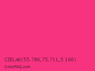 CIELab 55.786,75.711,5.166 Color is a normal rose color and the nearest color is Cerise Pink #ec3b83. Hex code #f73380 and RGB value is rgb(247,51,128). In RGB color space, this color is composed of 97% red, 20% green, 50% blue, In CMYK color space, this color is composed of 0% cyan, 79% magenta, 48% yellow , 3% black , In HSL color space, this color has a hue angle of 336° , 92% saturation and 58% lightness.