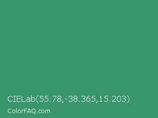 CIELab 55.78,-38.365,15.203 Color is a normal green color and the nearest color is Illuminating Emerald #319177. Hex code #38966a and RGB value is rgb(56,150,106). In RGB color space, this color is composed of 22% red, 59% green, 42% blue, In CMYK color space, this color is composed of 63% cyan, 0% magenta, 29% yellow , 41% black , In HSL color space, this color has a hue angle of 152° , 46% saturation and 40% lightness.