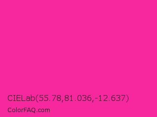 CIELab 55.78,81.036,-12.637 Color is a normal magenta color and the nearest color is Persian Rose #fe28a2. Hex code #f7279e and RGB value is rgb(247,39,158). In RGB color space, this color is composed of 97% red, 15% green, 62% blue, In CMYK color space, this color is composed of 0% cyan, 84% magenta, 36% yellow , 3% black , In HSL color space, this color has a hue angle of 326° , 93% saturation and 56% lightness.
