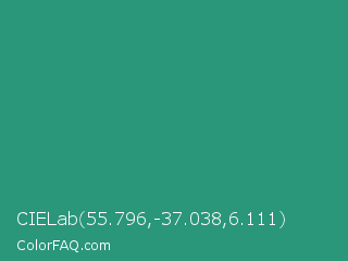 CIELab 55.796,-37.038,6.111 Color is a normal cyan color and the nearest color is Illuminating Emerald #319177. Hex code #2a967a and RGB value is rgb(42,150,122). In RGB color space, this color is composed of 16% red, 59% green, 48% blue, In CMYK color space, this color is composed of 72% cyan, 0% magenta, 19% yellow , 41% black , In HSL color space, this color has a hue angle of 164° , 56% saturation and 38% lightness.