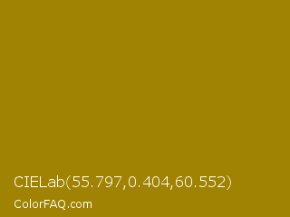 CIELab 55.797,0.404,60.552 Color is a normal yellow color and the nearest color is Dark Yellow #9b870c. Hex code #a08302 and RGB value is rgb(160,131,2). In RGB color space, this color is composed of 63% red, 51% green, 1% blue, In CMYK color space, this color is composed of 0% cyan, 18% magenta, 99% yellow , 37% black , In HSL color space, this color has a hue angle of 49° , 98% saturation and 32% lightness.