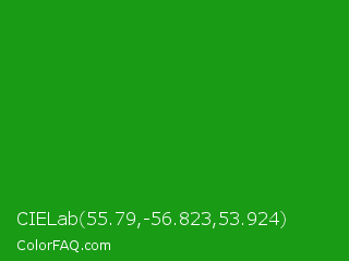 CIELab 55.79,-56.823,53.924 Color is a normal green color and the nearest color is Slimy Green #299617. Hex code #199b15 and RGB value is rgb(25,155,21). In RGB color space, this color is composed of 10% red, 61% green, 8% blue, In CMYK color space, this color is composed of 84% cyan, 0% magenta, 86% yellow , 39% black , In HSL color space, this color has a hue angle of 118° , 76% saturation and 35% lightness.