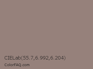 CIELab 55.7,6.992,6.204 Color is a normal red color and the nearest color is Cinereous #98817b. Hex code #96817b and RGB value is rgb(150,129,123). In RGB color space, this color is composed of 59% red, 51% green, 48% blue, In CMYK color space, this color is composed of 0% cyan, 14% magenta, 18% yellow , 41% black , In HSL color space, this color has a hue angle of 13° , 11% saturation and 54% lightness.