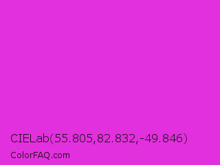 CIELab 55.805,82.832,-49.846 Color is a normal magenta color and the nearest color is Steel Pink #cc33cc. Hex code #e330de and RGB value is rgb(227,48,222). In RGB color space, this color is composed of 89% red, 19% green, 87% blue, In CMYK color space, this color is composed of 0% cyan, 79% magenta, 2% yellow , 11% black , In HSL color space, this color has a hue angle of 302° , 76% saturation and 54% lightness.