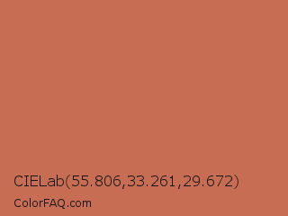 CIELab 55.806,33.261,29.672 Color is a normal red color and the nearest color is Copper Red #cb6d51. Hex code #c76d54 and RGB value is rgb(199,109,84). In RGB color space, this color is composed of 78% red, 43% green, 33% blue, In CMYK color space, this color is composed of 0% cyan, 45% magenta, 58% yellow , 22% black , In HSL color space, this color has a hue angle of 13° , 51% saturation and 55% lightness.