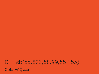 CIELab 55.823,58.99,55.155 Color is a normal red color and the nearest color is Flamingo #f2552a. Hex code #ed4f26 and RGB value is rgb(237,79,38). In RGB color space, this color is composed of 93% red, 31% green, 15% blue, In CMYK color space, this color is composed of 0% cyan, 67% magenta, 84% yellow , 7% black , In HSL color space, this color has a hue angle of 12° , 85% saturation and 54% lightness.