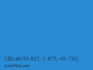 CIELab 55.827,-1.875,-45.733 Color is a normal blue color and the nearest color is Curious Blue #2596d1. Hex code #298bd5 and RGB value is rgb(41,139,213). In RGB color space, this color is composed of 16% red, 55% green, 84% blue, In CMYK color space, this color is composed of 81% cyan, 35% magenta, 0% yellow , 16% black , In HSL color space, this color has a hue angle of 206° , 68% saturation and 50% lightness.