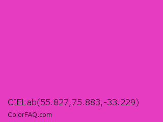 CIELab 55.827,75.883,-33.229 Color is a normal magenta color and the nearest color is Frostbite #e936a7. Hex code #e53cc1 and RGB value is rgb(229,60,193). In RGB color space, this color is composed of 90% red, 24% green, 76% blue, In CMYK color space, this color is composed of 0% cyan, 74% magenta, 16% yellow , 10% black , In HSL color space, this color has a hue angle of 313° , 76% saturation and 57% lightness.
