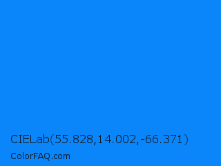 CIELab 55.828,14.002,-66.371 Color is a normal blue color and the nearest color is Azure Radiance #007fff. Hex code #0a85fa and RGB value is rgb(10,133,250). In RGB color space, this color is composed of 4% red, 52% green, 98% blue, In CMYK color space, this color is composed of 96% cyan, 47% magenta, 0% yellow , 2% black , In HSL color space, this color has a hue angle of 209° , 96% saturation and 51% lightness.