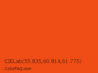 CIELab 55.835,60.814,61.775 Color is a normal color and the nearest color is Orioles Orange #fb4f14. Hex code #f04c15 and RGB value is rgb(240,76,21). In RGB color space, this color is composed of 94% red, 30% green, 8% blue, In CMYK color space, this color is composed of 0% cyan, 68% magenta, 91% yellow , 6% black , In HSL color space, this color has a hue angle of 15° , 88% saturation and 51% lightness.