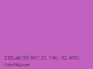 CIELab 55.867,51.746,-32.409 Color is a normal magenta color and the nearest color is Fuchsia Pink #c154c1. Hex code #c261bf and RGB value is rgb(194,97,191). In RGB color space, this color is composed of 76% red, 38% green, 75% blue, In CMYK color space, this color is composed of 0% cyan, 50% magenta, 2% yellow , 24% black , In HSL color space, this color has a hue angle of 302° , 44% saturation and 57% lightness.