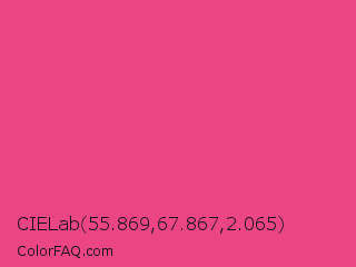 CIELab 55.869,67.867,2.065 Color is a normal rose color and the nearest color is Cerise Pink #ec3b83. Hex code #ec4585 and RGB value is rgb(236,69,133). In RGB color space, this color is composed of 93% red, 27% green, 52% blue, In CMYK color space, this color is composed of 0% cyan, 71% magenta, 44% yellow , 7% black , In HSL color space, this color has a hue angle of 337° , 81% saturation and 60% lightness.