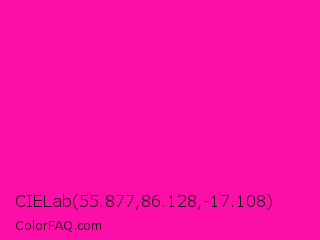 CIELab 55.877,86.128,-17.108 Color is a normal magenta color and the nearest color is Hollywood Cerise #f400a1. Hex code #fc0fa6 and RGB value is rgb(252,15,166). In RGB color space, this color is composed of 99% red, 6% green, 65% blue, In CMYK color space, this color is composed of 0% cyan, 94% magenta, 34% yellow , 1% black , In HSL color space, this color has a hue angle of 322° , 98% saturation and 52% lightness.