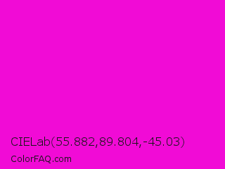 CIELab 55.882,89.804,-45.03 Color is a normal magenta color and the nearest color is Purple Pizzazz #ff00cc. Hex code #f10bd6 and RGB value is rgb(241,11,214). In RGB color space, this color is composed of 95% red, 4% green, 84% blue, In CMYK color space, this color is composed of 0% cyan, 95% magenta, 11% yellow , 5% black , In HSL color space, this color has a hue angle of 307° , 91% saturation and 49% lightness.