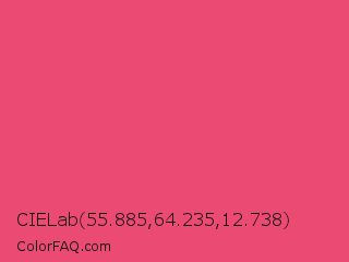 CIELab 55.885,64.235,12.738 Color is a light red color and the nearest color is Dark Pink #e75480. Hex code #eb4a73 and RGB value is rgb(235,74,115). In RGB color space, this color is composed of 92% red, 29% green, 45% blue, In CMYK color space, this color is composed of 0% cyan, 69% magenta, 51% yellow , 8% black , In HSL color space, this color has a hue angle of 345° , 80% saturation and 61% lightness.