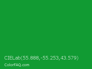 CIELab 55.888,-55.253,43.579 Color is a normal green color and the nearest color is North Texas Green #059033. Hex code #119b33 and RGB value is rgb(17,155,51). In RGB color space, this color is composed of 7% red, 61% green, 20% blue, In CMYK color space, this color is composed of 89% cyan, 0% magenta, 67% yellow , 39% black , In HSL color space, this color has a hue angle of 135° , 80% saturation and 34% lightness.