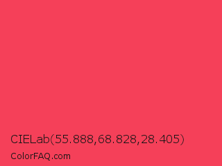 CIELab 55.888,68.828,28.405 Color is a light red color and the nearest color is Desire #ea3c53. Hex code #f54059 and RGB value is rgb(245,64,89). In RGB color space, this color is composed of 96% red, 25% green, 35% blue, In CMYK color space, this color is composed of 0% cyan, 74% magenta, 64% yellow , 4% black , In HSL color space, this color has a hue angle of 352° , 90% saturation and 61% lightness.