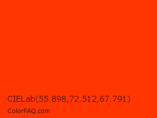CIELab 55.898,72.512,67.791 Color is a normal red color and the nearest color is Coquelicot #ff3800. Hex code #ff3502 and RGB value is rgb(255,53,2). In RGB color space, this color is composed of 100% red, 21% green, 1% blue, In CMYK color space, this color is composed of 0% cyan, 79% magenta, 99% yellow , 0% black , In HSL color space, this color has a hue angle of 12° , 100% saturation and 50% lightness.
