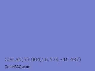 CIELab 55.904,16.579,-41.437 Color is a light blue color and the nearest color is Moody Blue #7f76d3. Hex code #7780ce and RGB value is rgb(119,128,206). In RGB color space, this color is composed of 47% red, 50% green, 81% blue, In CMYK color space, this color is composed of 42% cyan, 38% magenta, 0% yellow , 19% black , In HSL color space, this color has a hue angle of 234° , 47% saturation and 64% lightness.
