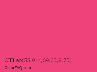 CIELab 55.914,69.03,8.75 Color is a normal rose color and the nearest color is Cerise Pink #ec3b83. Hex code #f0427a and RGB value is rgb(240,66,122). In RGB color space, this color is composed of 94% red, 26% green, 48% blue, In CMYK color space, this color is composed of 0% cyan, 73% magenta, 49% yellow , 6% black , In HSL color space, this color has a hue angle of 341° , 85% saturation and 60% lightness.