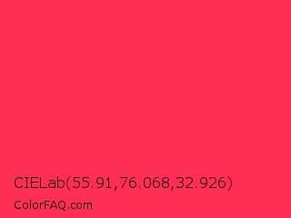 CIELab 55.91,76.068,32.926 Color is a normal red color and the nearest color is Sizzling Red #ff3855. Hex code #ff2e52 and RGB value is rgb(255,46,82). In RGB color space, this color is composed of 100% red, 18% green, 32% blue, In CMYK color space, this color is composed of 0% cyan, 82% magenta, 68% yellow , 0% black , In HSL color space, this color has a hue angle of 350° , 100% saturation and 59% lightness.