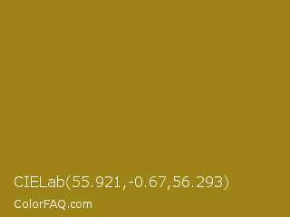 CIELab 55.921,-0.67,56.293 Color is a normal yellow color and the nearest color is Reef Gold #9f821c. Hex code #9e8417 and RGB value is rgb(158,132,23). In RGB color space, this color is composed of 62% red, 52% green, 9% blue, In CMYK color space, this color is composed of 0% cyan, 16% magenta, 85% yellow , 38% black , In HSL color space, this color has a hue angle of 48° , 75% saturation and 35% lightness.