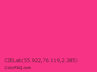 CIELab 55.922,76.119,2.385 Color is a normal rose color and the nearest color is Cerise Pink #ec3b83. Hex code #f73385 and RGB value is rgb(247,51,133). In RGB color space, this color is composed of 97% red, 20% green, 52% blue, In CMYK color space, this color is composed of 0% cyan, 79% magenta, 46% yellow , 3% black , In HSL color space, this color has a hue angle of 335° , 92% saturation and 58% lightness.