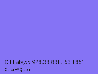 CIELab 55.928,38.831,-63.186 Color is a light indigo color and the nearest color is Medium Slate Blue #7b68ee. Hex code #8573f5 and RGB value is rgb(133,115,245). In RGB color space, this color is composed of 52% red, 45% green, 96% blue, In CMYK color space, this color is composed of 46% cyan, 53% magenta, 0% yellow , 4% black , In HSL color space, this color has a hue angle of 248° , 87% saturation and 71% lightness.