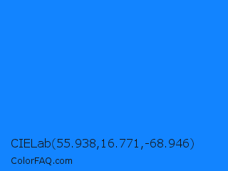CIELab 55.938,16.771,-68.946 Color is a normal blue color and the nearest color is Dodger Blue #1e90ff. Hex code #1284ff and RGB value is rgb(18,132,255). In RGB color space, this color is composed of 7% red, 52% green, 100% blue, In CMYK color space, this color is composed of 93% cyan, 48% magenta, 0% yellow , 0% black , In HSL color space, this color has a hue angle of 211° , 100% saturation and 54% lightness.