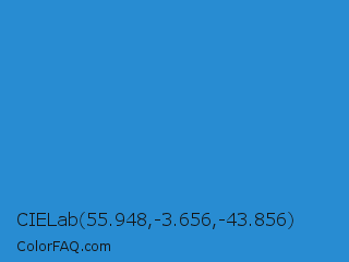 CIELab 55.948,-3.656,-43.856 Color is a normal blue color and the nearest color is Curious Blue #2596d1. Hex code #288cd2 and RGB value is rgb(40,140,210). In RGB color space, this color is composed of 16% red, 55% green, 82% blue, In CMYK color space, this color is composed of 81% cyan, 33% magenta, 0% yellow , 18% black , In HSL color space, this color has a hue angle of 205° , 68% saturation and 49% lightness.