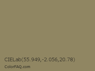 CIELab 55.949,-2.056,20.78 Color is a normal yellow color and the nearest color is Clay Creek #8a8360. Hex code #908662 and RGB value is rgb(144,134,98). In RGB color space, this color is composed of 56% red, 53% green, 38% blue, In CMYK color space, this color is composed of 0% cyan, 7% magenta, 32% yellow , 44% black , In HSL color space, this color has a hue angle of 47° , 19% saturation and 47% lightness.